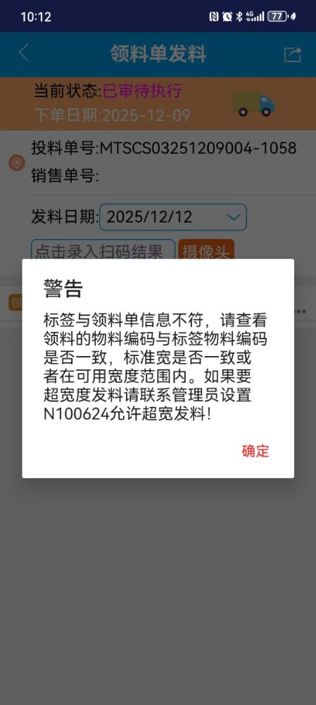 :扫码领料单标签发料时弹出“标签与领料单信息不符,请查看领料的物料编码与标签物料编码是否一致,标准宽是否一致或者在可用宽度范围内。”