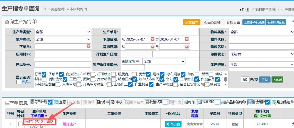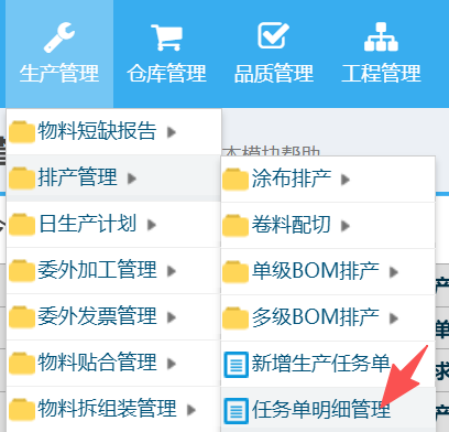 操作步骤:生产管理-排产管理-任务单明细管理