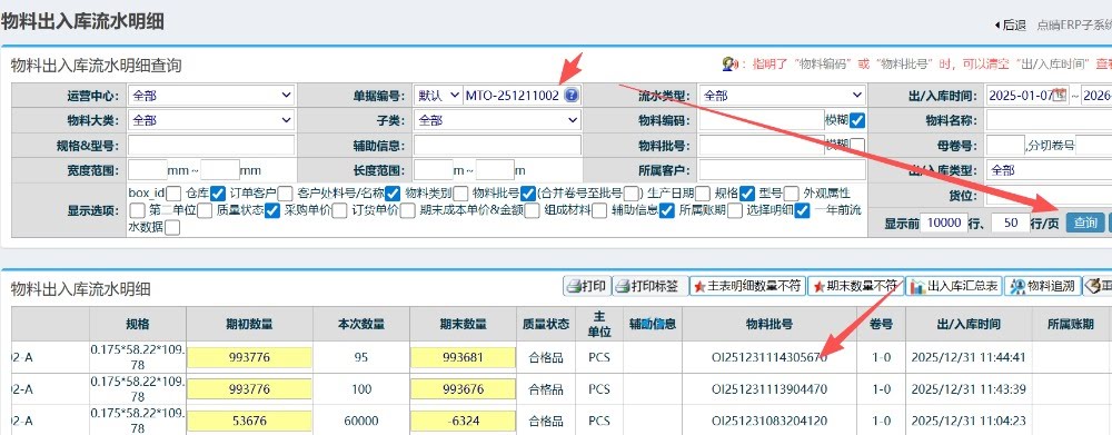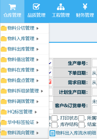 操作步骤:仓库管理-物料流向管理-物料出入库管理明细