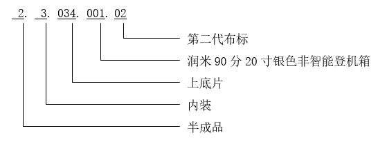 例:物料代码“02.03.034.001.02”代表“润米90分20寸银色非智能登机箱  上底片  (第二代布标)”。