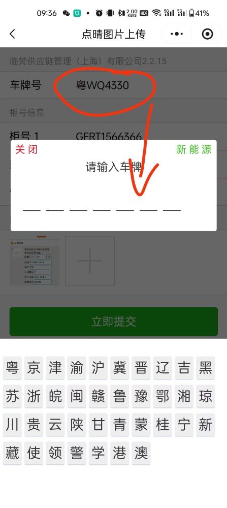 答:在微信打开点晴货柜图片上传小程序,输入对应车牌号以及货柜号上传图片然后点击立即提交即可。