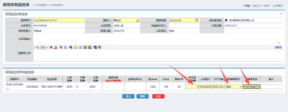 进入界面后,输入对应的品检数量,将质量状态选择为废品/不良品,将仓位选择为退货仓/不良仓