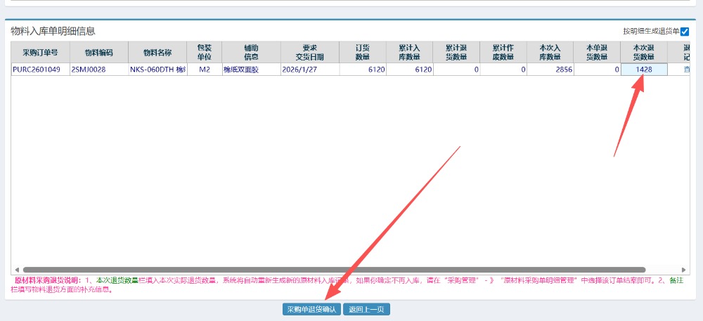 确定好数值后,点击采购退货确认,完成操作