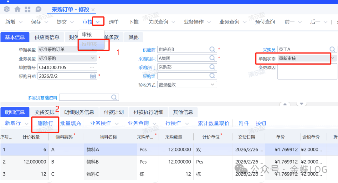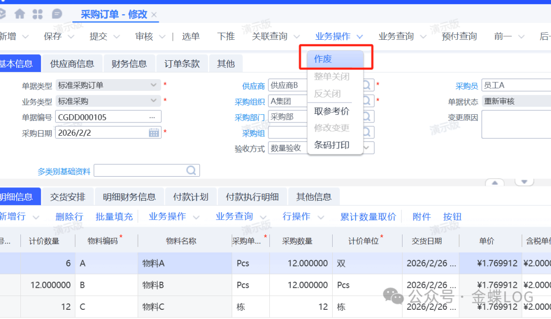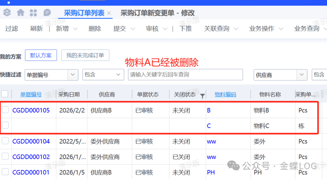 [点晴模切ERP]金蝶云星空采购订单有多行物料,如何作废或删除其中一颗?