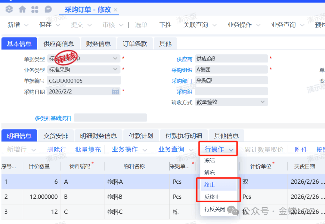 如果订单其中一行物料已经下推收料单或入库单等下游单据,则整张订单是无法再反审核了,这个时候有两种方式 直接终止 或 走变更单