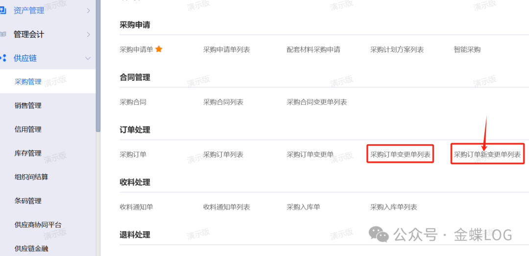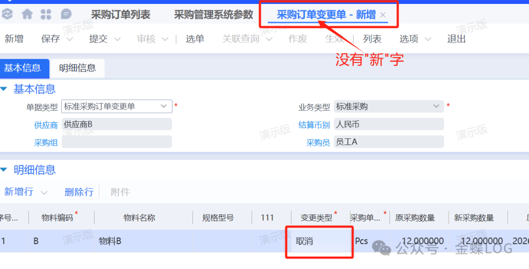 系统的采购变更单一共有两种,它们在命名上的区别主要是一个有带“”字,一个没有。