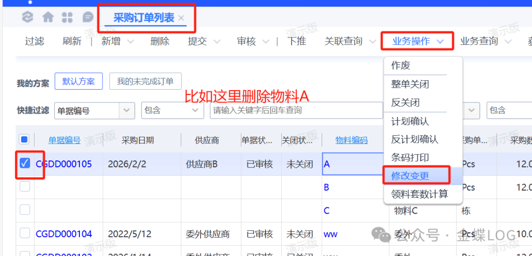 找到要修改的订单,勾选具体要删除的物料,点击【业务操作】里面的【修改变更】