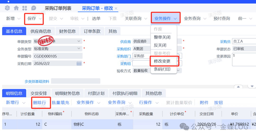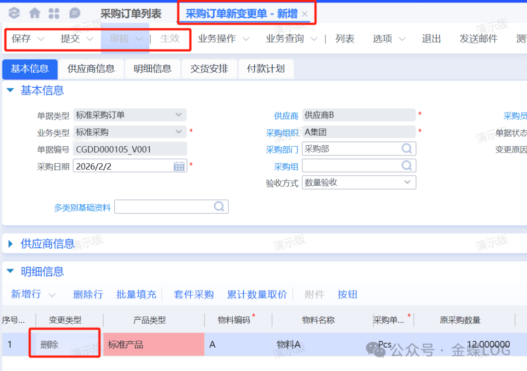 系统会生成一张【采购订单变更单】这个时候【变更类型】选择【删除】,然后保存,提交,审核,生效。系统默认审核后会自动生效,生效之后变更单就不允许再反审核删除了,所以确认修改内容后再点击审核。