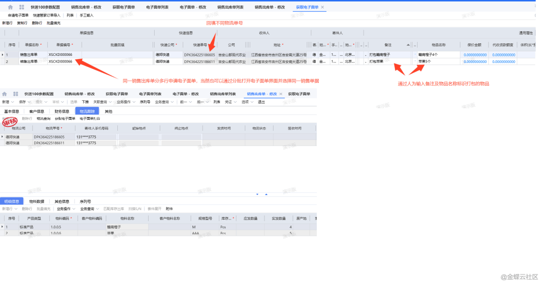 上图1-1这种就是一个销售单据对应一个快递100物流单号的情况,这种适用于把一个销售单据上的所有明细信息中的物料打包成一个包裹然后邮寄出去并通过一个物流单号跟踪包裹的详细物流轨迹信息,如果客户是想把一个销售单据上的所有物料分批打包并通过多个物流单号跟踪物流详细轨迹信息,则可以对同一销售单据分多次申请电子面单(快递100参数配置中也有可以控制是否最多能申请一次电子面单的选项),如下图2-1和2-2所示: