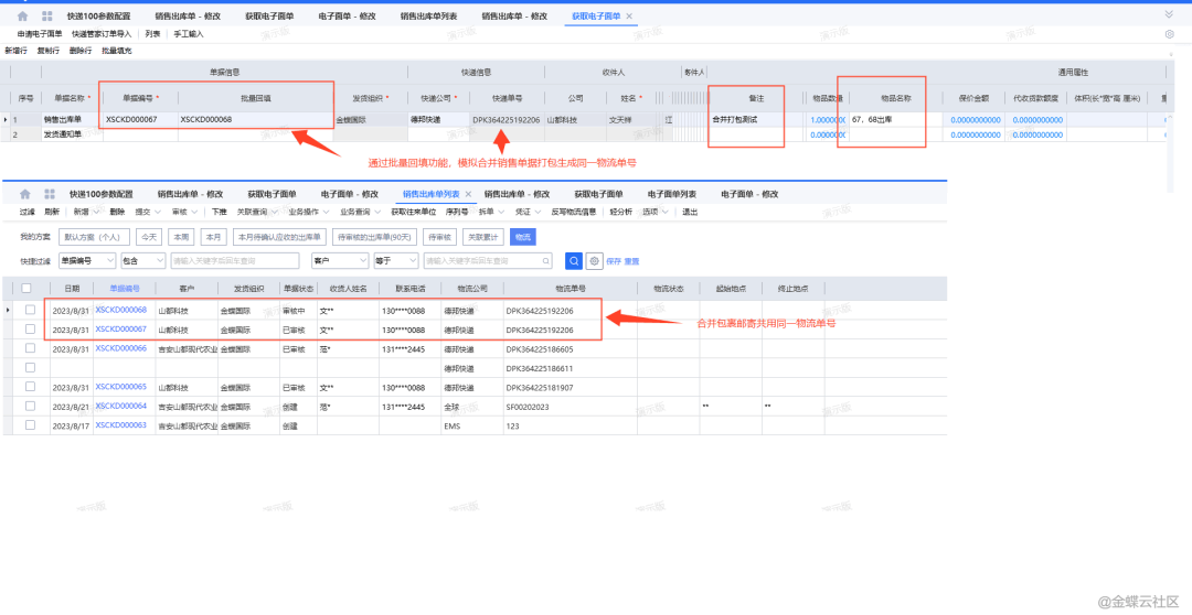 上图2-1和图2-2这种就是一个销售单据对应多个物流单号的情况,如果客户想把多个销售单据合并打包成一个包裹并通过一个物流单号跟踪多个销售单据的物流详细轨迹信息,则可以通过使用批量回填功能,如下图3-1和图3-2所示: