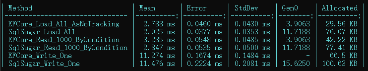 下面是10万条数据.NET Framework472,EFCore与SqlSugar 加载、读取、写入操作的Benchmark性能分析情况: