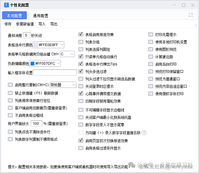 该个性化配置只适用于单个用户、单个客户端或机器生效,如果用户更换使用客户端或者PC机器可以使用导入导出功能。