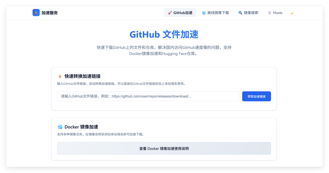 🆔网站名称:HubProxy⭐网站功能:代理加速服务📁网站简介:一个多功能代理加速服务工具。主要提供Docker镜像加速、GitHub文件加速、离线镜像下载等功能,通过单域名实现所有功能。🔗网站网址:点击打开🔗开源地址:点击访问🚀Docker和GitHub加速代理服务器一个轻量级、高性能的多功能代理服务,提供...