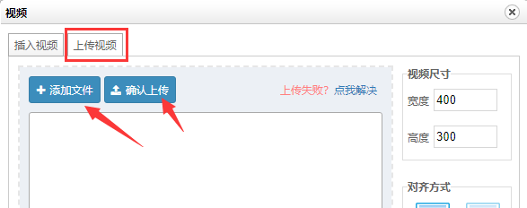 在编辑器中找到文件上传按钮,点击添加视频上传