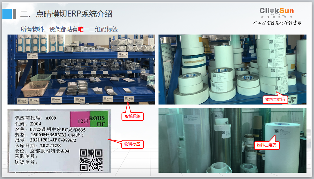 即对物资料签统一制作格式和所需填写的项目内容,逐步探索将条码引入物资标识,通过扫描商品的条形码。实现实时查询其存储的货位,同时基于库存货位信息分配货位或动态定义货位。基于出入库商品的批量动态地分配人力、物力资源,充分利用资源,提高系统的运行效率,减少资源的浪费。以实现库存实物管理与物资信息管理系统融合,推进实现库存自动化盘点和精细化管理。即对标识内容的填写、维护、更换划分责任,做到货位规范化、管理条码化。条码是商品的唯一标识,现代商业管理(包括仓库管理系统)的基础是商品的条码化。结合目前的物资管理信息系统,通过开发系统库存综合盘点功能,就可以分仓库、分区、分货位进行随机抽查,也可以针对特定类抽查,定期对整个仓库系统进行全面的盘点。一是对划定后的货位界线标识定期维护,二是对标识标牌定期维护或更新。确保实现实时货位查询和货位动态分配、管理。“货位清则标识明,标识明则管理成”。清晰规范的货位,显明准确的标识,是仓储管理的根基。随着现代物流技术的应用,信息技术和仓储管理水平的不断提高,将大幅提高仓储运作与管理的工作效率。大幅度减少现有模式中管理货位信息的时间,提高库存查询和盘点精度,大大加快出、入库单据的流转速度,减少人、财、物的资源浪费。点晴模切ERP更多信息:http://moqie.clicksun.cn,联系电话:4001861886