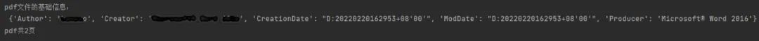 # 打开pdf文件,有密码加入password参数pdf_info =pdfplumber.open(r'test.pdf')meta_data = pdf_info.metadata  # pdf的基础信息page_con = len(pdf_info.pages)  # 获取pdf的总页数print('pdf文件的基础信息:\n', meta_data)print('pdf共%s页' % page_con)