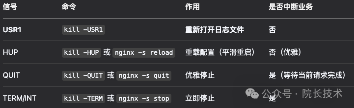 USR1 (User Signal 1) 是 Nginx 设计用来处理的一个自定义信号,它的唯一作用是: