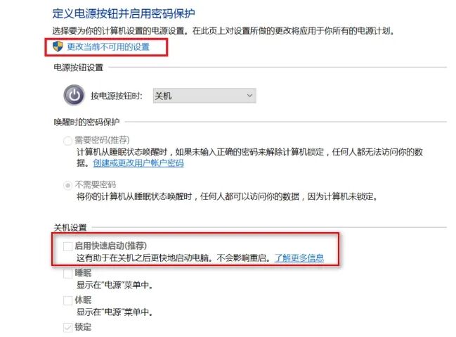 控制面板中进入「电源选项」-「选择电源按钮的功能」-「更改当前不可用的设置」,取消勾选「启用快速启动」,然后保存更改