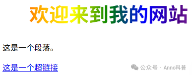 <!DOCTYPE html><html>  <head>  <title>我的第一个网页</title>  </head>  <body>    <h1>欢迎来到我的网站</h1>    <p>这是一个段落。</p>    <a href="https://example.com">这是一个超链接</a>  </body></html>