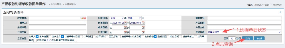 6.查询得到当前的单据状态,选择对应的送货单信息,点击“对账收款回单”。