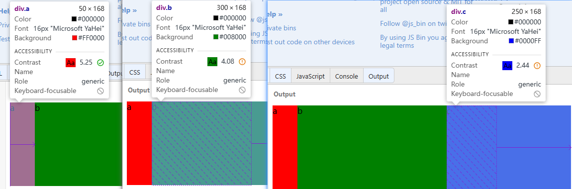演示地址:https://jsbin.com/fibecijohi/edit?html,css,output 计算解析: Flex容器container下有三个子项分别为a,b,c 容器的宽度为600 总的basis = 0(a)+200(b)+100(s) = 300 总的grow = 1(a)+2(b)+3(c) = 6 a项的宽度= 0 + (600 - 300) * 1/6 = 50 b项的宽度= 200 + (600 - 300) * 2/6 = 300 c项的宽度= 100 + (600 - 300) *3/6 = 250 当空间不足时,flex-shrink生效,元素尺寸变小一起减小不足的空间当前项的最终宽度 = basis - (总的basis - 容器宽度) * (当前项的basis * 当前项的sthrink)/(各元素的basic * 各元素的shrink之和),下面来看一个示例 代码如下: