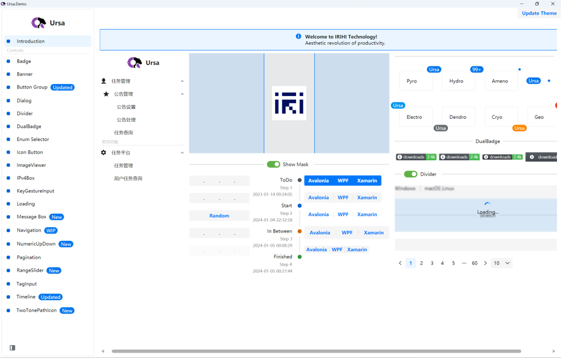 Avalonia是什么?Avalonia是一个强大的框架,使开发人员能够使用.NET创建跨平台应用程序。它使用自己的渲染引擎绘制UI控件,确保在Windows、macOS、Linux、Android、iOS和WebAssembly等不同平台上具有一致的外观和行为。这意味着开发人员可以共享他们的UI代码,并在不同的目标平台上保持统一的外观和感觉。 Dotnet和Avalonia都是MIT协议,相关的代码地址是: Semi.Avalonia和Ursa.Avalonia(一)Semi.Avalonia - 主题风格的魅力实现Semi.Avalonia,这是以 MIT 协议开源的 Avalonia UI 框架下的 Semi Design 主题风格的精妙呈现。它为应用程序带来独特的视觉风格,如同一幅精美的画卷,为用户界面增添了丰富的色彩和质感。 其仓库地址为:https://github.com/irihitech/Semi.Avalonia (二)Ursa.Avalonia - 自定义控件的创新力量搭配同样遵循 MIT 协议的Ursa.Avalonia自定义控件库,更是如虎添翼。它们携手为开发者缔造全新的视觉与功能体验,仿佛为开发之旅开启了一扇通往无限可能的大门。 仓库地址:https://github.com/irihitech/Ursa.Avalonia 在信创及国产操作系统领域表现值得一提的是,这两个库在信创及国产操作系统领域表现出色,已完成与龙芯 3A6000 和龙架构(LoongArch™)的兼容互认证,这是自主可控和国产化技术推进的重要成果。 下面信息引用来自微信公众号【铱泓科技】8月2号的文章 《Ursa与Semi正式完成龙架构兼容互认证》: