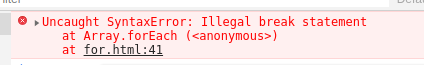 2、定义一个字段用来判断什么时候跳出外层循环 var array = [1,2,3,4,5]; var flag = false; // 为true时说明需要跳出外层循环 for (let i = 0; i < array.length; i++) { for (let j = 0; j < array.length; j++) { if (i==2&&j==2) { flag = true; break; } console.log(i,j); } if (flag) { break; } } 打印出的结果和1中的结果一样。 3、当循环语句写在函数中时直接用return语句终止双重循环 var array = [1,2,3,4,5]; var func = function() { for (let i = 0; i < array.length; i++) { for (let j = 0; j < array.length; j++) { if (i==2&&j==2) { return; } console.log(i,j); } } } func(); 打印出的结果和1中的结果一样,这里使用retun跳出函数,同时也跳出循环语句。 如何跳出forEach循环首先需要注意的是在forEach中不能使用continue和break,否则会报如下错误。 1、使用retun结束当前循环 var array = [1,2,3,4,5]; array.forEach((el,i)=>{ if (el==3) { return; } console.log(el); }) 打印出的结果为1,2,4,5,当满足3这个条件时跳出当前循环,不执行return后面的语句,转而执行下个循环,其作用相当于for循环里使用continue。 2、使用数组的some()函数或every()函数替代forEach 转自https://www.cnblogs.com/tsl0324/p/14971559.html 该文章在 2025/11/1 9:26:33 编辑过 |