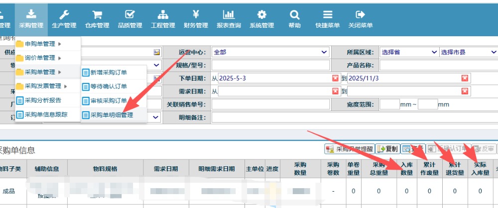 [点晴模切ERP]如何在采购单上显示或体现已交数量、未交数量以及订单状态(是否正常结案)?