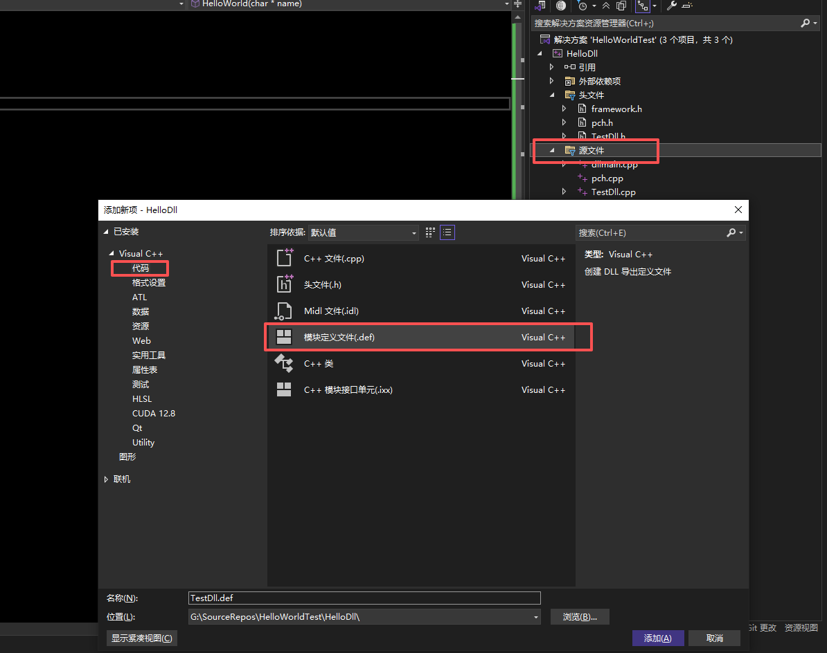 在源文件上点击右键,选择添加-》新建项,然后选择 代码-》模块定义文件,添加TestDll.def 文件