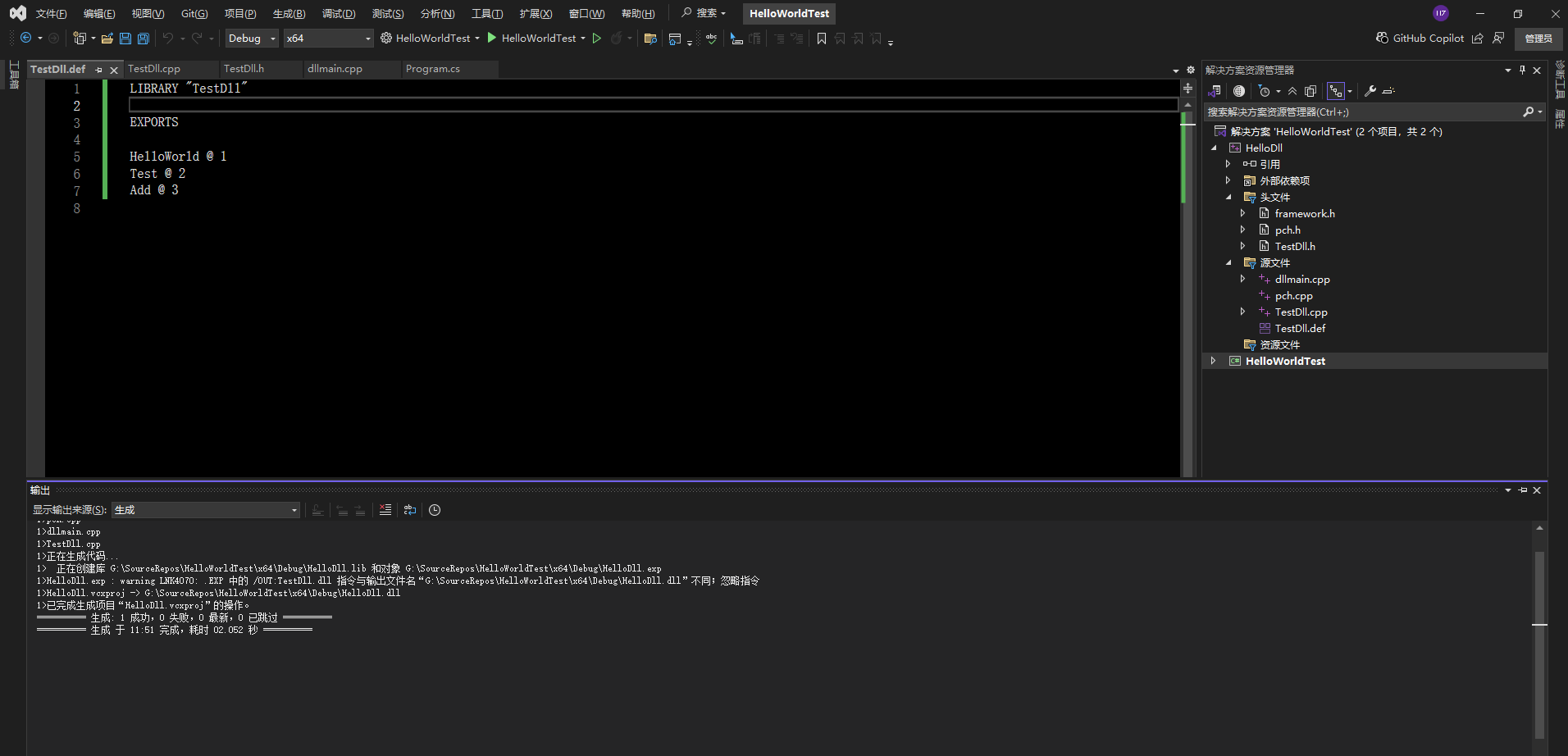 然后在 TestDll.cpp 文件 添加代码,如下